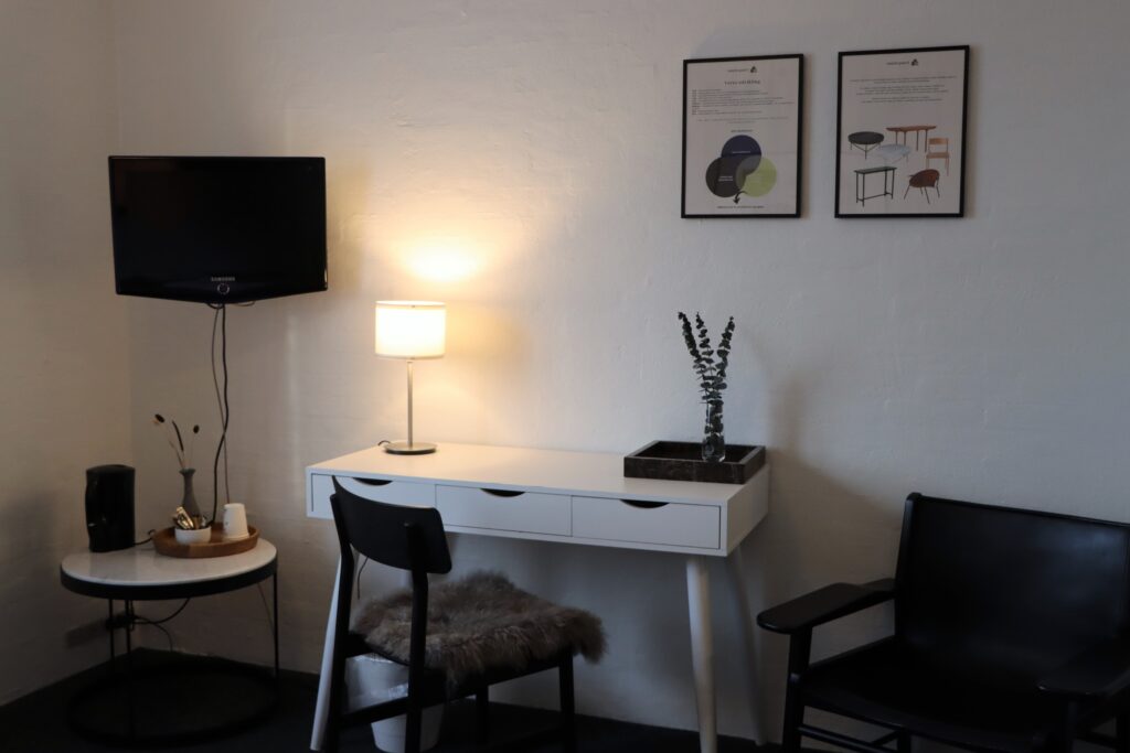På værelse 1 finder du et dejligt værelse, der er indrettet af den lokale møbelvirksomhed Østergaard. Østergaard samarbejder i dag med forskellige designhuse, hvor de sammen med arkitekter udvikler forskellige møbler ud fra ønsker om design, materialer og overfladebehandlinger. Østergaard værelset bærer præg af lækkert design og kvalitetsprodukter.